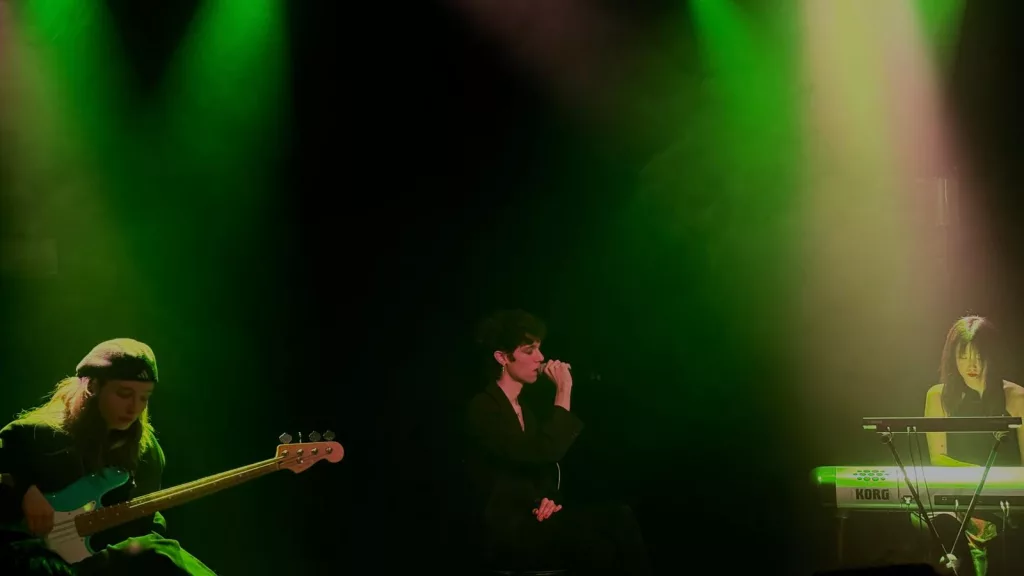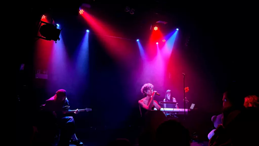 Nous entendions sa voix, mais aucune silhouette à l’horizon. Caché·e en coulisses, c’est dans une atmosphère égrillarde qu’OWNI a fait son entrée dans un joli costume noir, accompagné·e de Romane aux cordes et de Lynn au piano sous une lumière rouge sang. C’est par une voix douce et élégante que le spectacle a commencé.