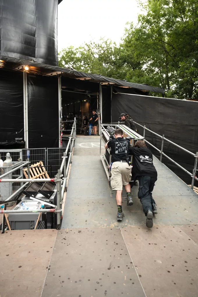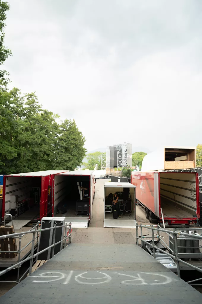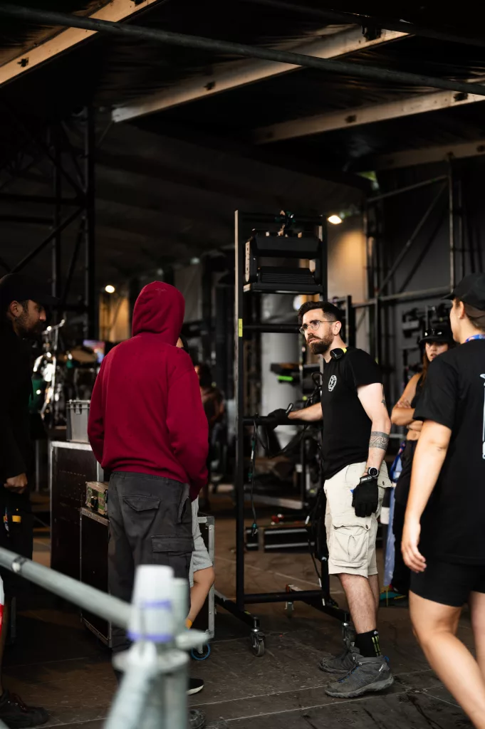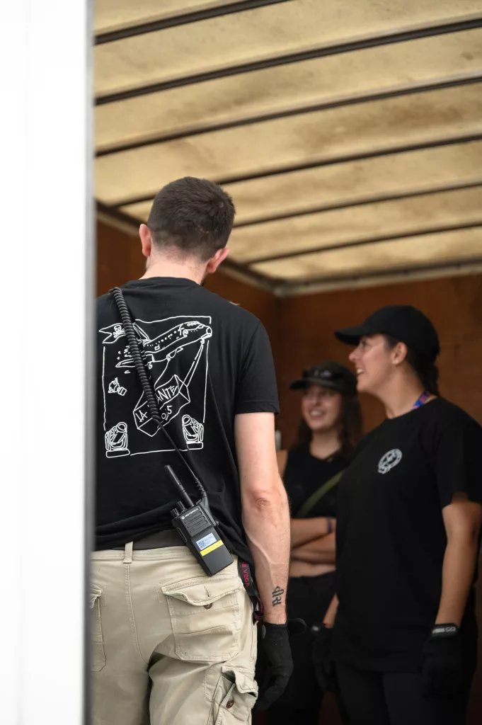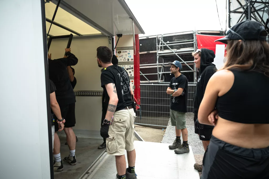 On croise généralement Julien avec une mallette la main — et à l’intérieur, tout ce qui sauve un concert : platines de rechange, mixettes, adaptateurs. Responsable du dispatch dans l’équipe technique des scènes de la Volante, il veille à ce que chaque scène ait ce qu’il faut, au bon moment. On l’a suivi dans son camion, à pied dans les allées du festival, et jusqu’au bout de la nuit dans les soirées tardives des équipes de scène.