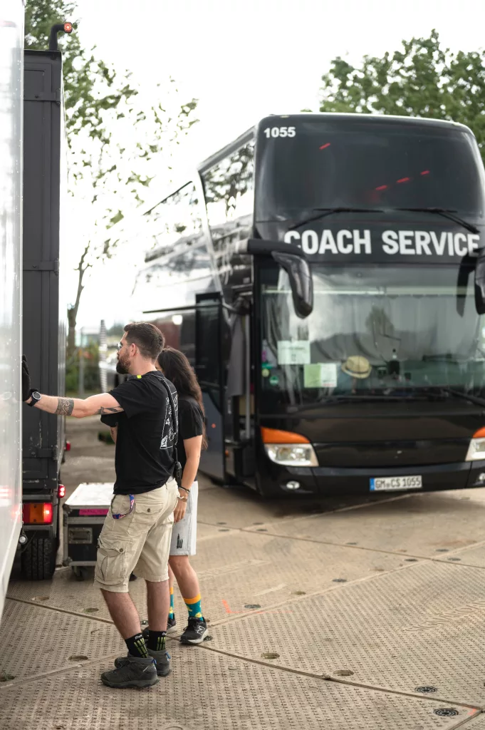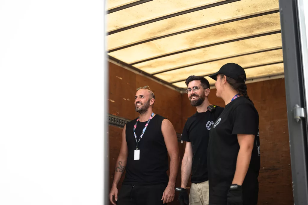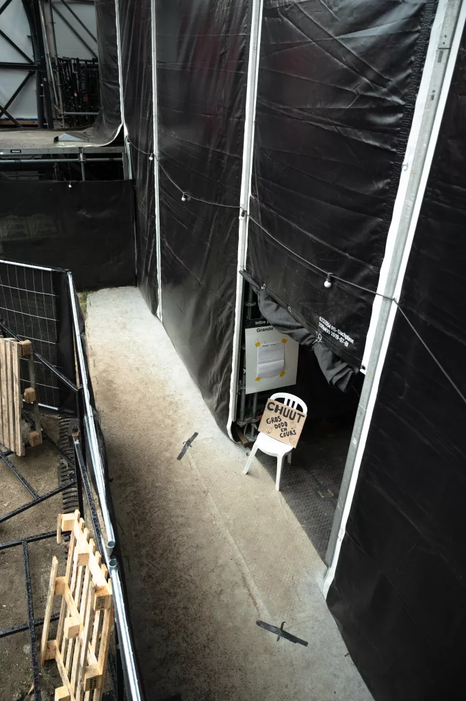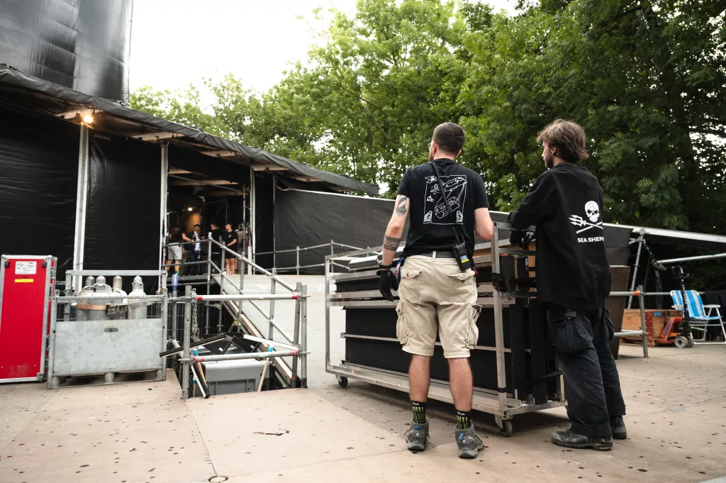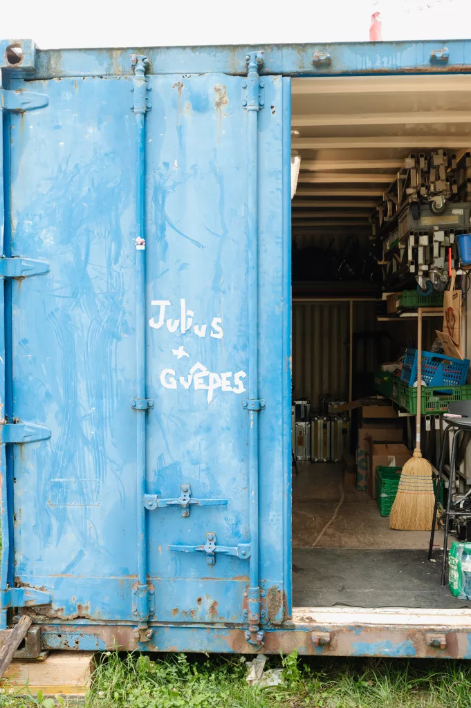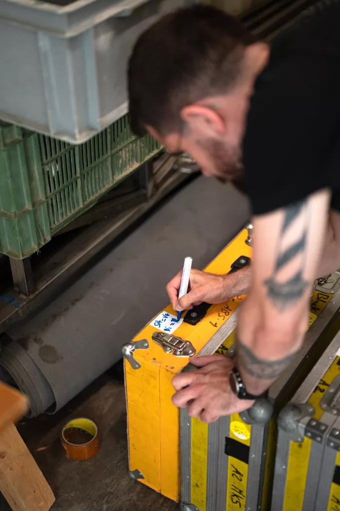 On croise généralement Julien avec une mallette la main — et à l’intérieur, tout ce qui sauve un concert : platines de rechange, mixettes, adaptateurs. Responsable du dispatch dans l’équipe technique des scènes de la Volante, il veille à ce que chaque scène ait ce qu’il faut, au bon moment. On l’a suivi dans son camion, à pied dans les allées du festival, et jusqu’au bout de la nuit dans les soirées tardives des équipes de scène.