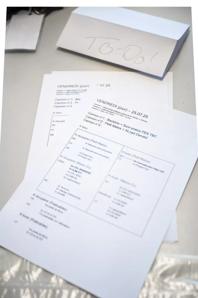 Pour répondre aux changements et aux demandes de matériel de dernière minute, je dois savoir où tout se trouve en tout temps Il faut parfois remplacer une platine DJ ou une table de mix en urgence : la question est alors de savoir s’il reste du spare ou si tout est déjà utilisé sur les scènes. Quand c’est le cas, il faut trouver une solution et assurer les livraisons… à pied, puisque le terrain est déjà ouvert !