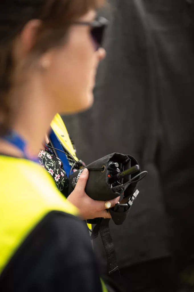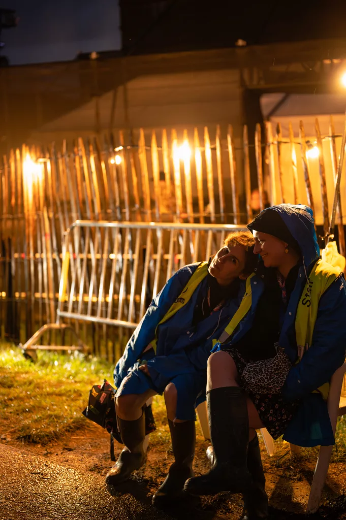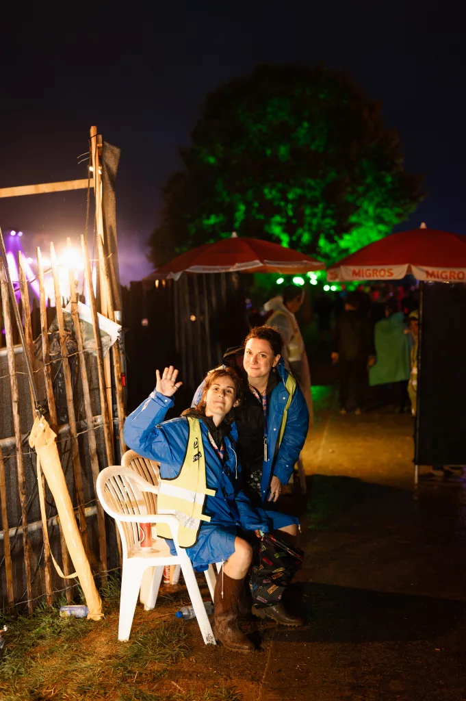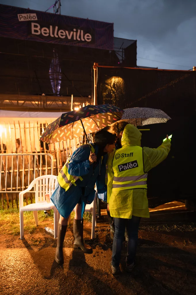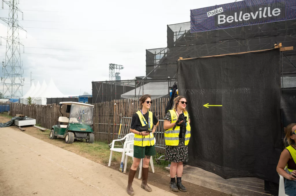 On s’occupe des « accès sécurité scène » depuis plus de 10 ans ! On a commencé dès nos 18 ans. On faisait partie de l’équipe sécurité du Détour avant la réorganisation du Paléo en 2022. A Belleville, on est nombreux-ses à avoir connu le Détour et à revenir chaque été. C’est une équipe soudée et qui nous a vues grandir. Du coup, notre rôle est de filtrer l’entrée des loges à l’arrière de la scène, car c’est par là qu’arrivent les artistes qui se produisent à Belleville !