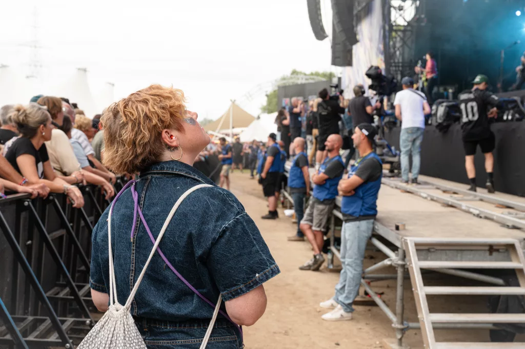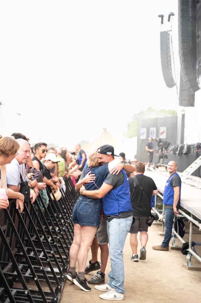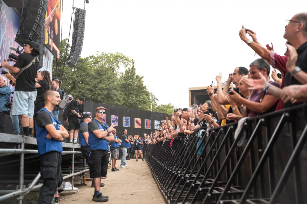 Avant que le concert commence, quand on arrive dans la fosse devant la Grande Scène, et qu’on voit tout le public heureux et prêt à profiter du moment !